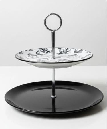 Einzigartig & elegant. Handgefertigte 2-stöckige Etagere mit schwarzem Fischmotiv auf weißem Porzellan – stilvolles Statement mit Charakter.