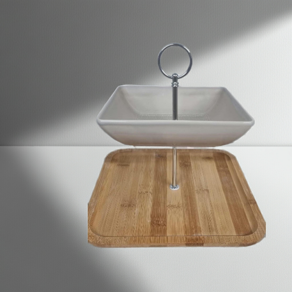 2-stöckige Etagere im Landhaus-Design- eine stilvolle Mischung aus Porzellan und massivem Bambus-Holzbrett schafft eine elegante Verbindung von  Natürlichkeit und Wertigkeit!