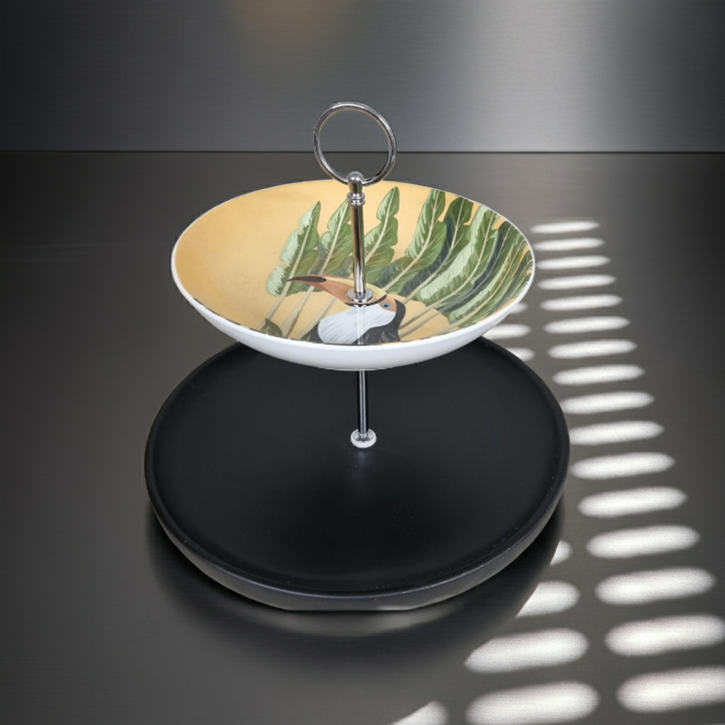 Diese handgefertigte Etagere kombiniert modernes Schwarz (Mangoholz) mit einem exotischen Porzellanteller – und wird garantiert zum Hingucker auf jedem Tisch.
