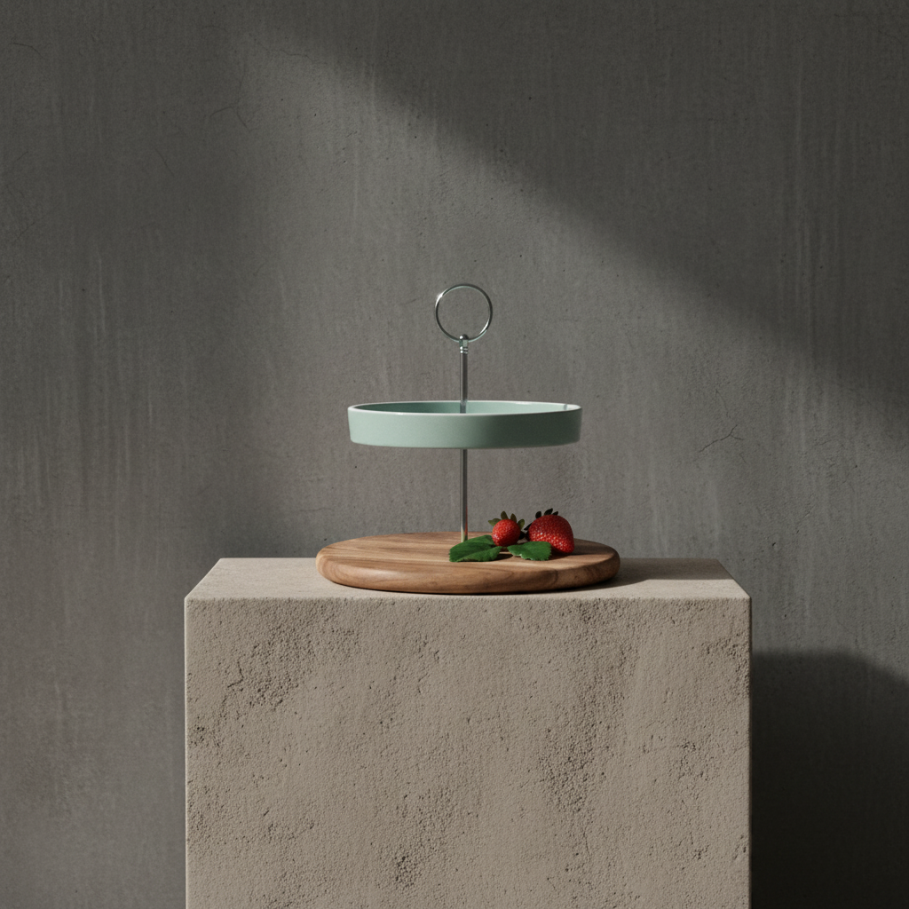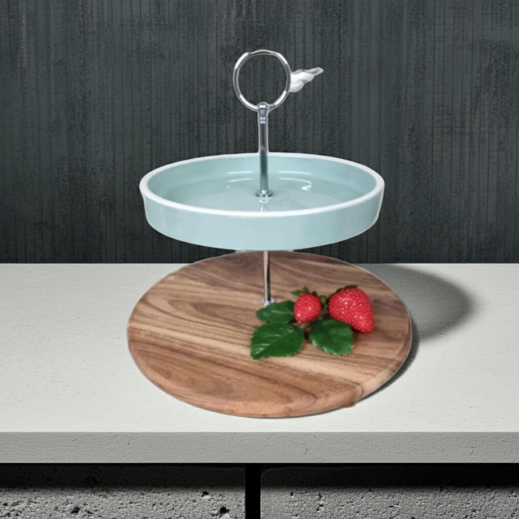 Stilvoll und handgemacht – Etagere aus Keramik und massivem Akazien Holz.
