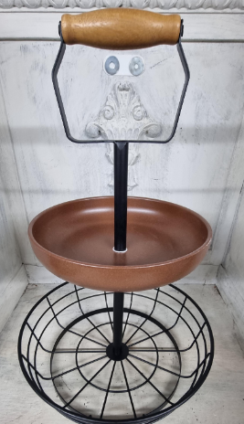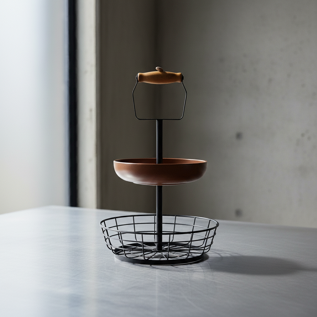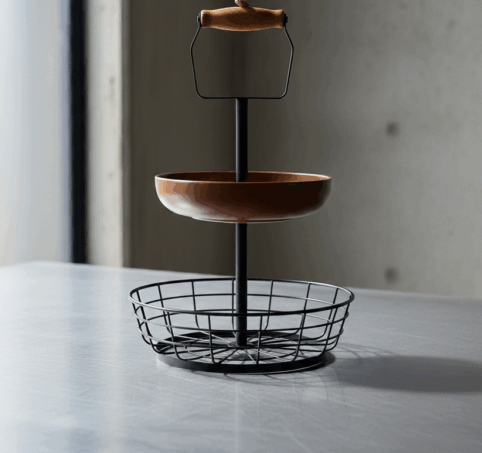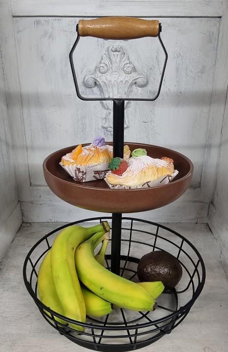 Der obere Teller hat einen Durchmesser von rund 22 x 4 cm; der Drahtkorb misst in den Dimensionen von 30 x 9 cm.