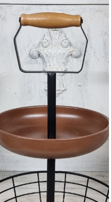 Diese zweistufige Etagere aus Keramik erreicht eine Höhe von etwa 45 cm mit einem stabilen Metallgestänge darunter.