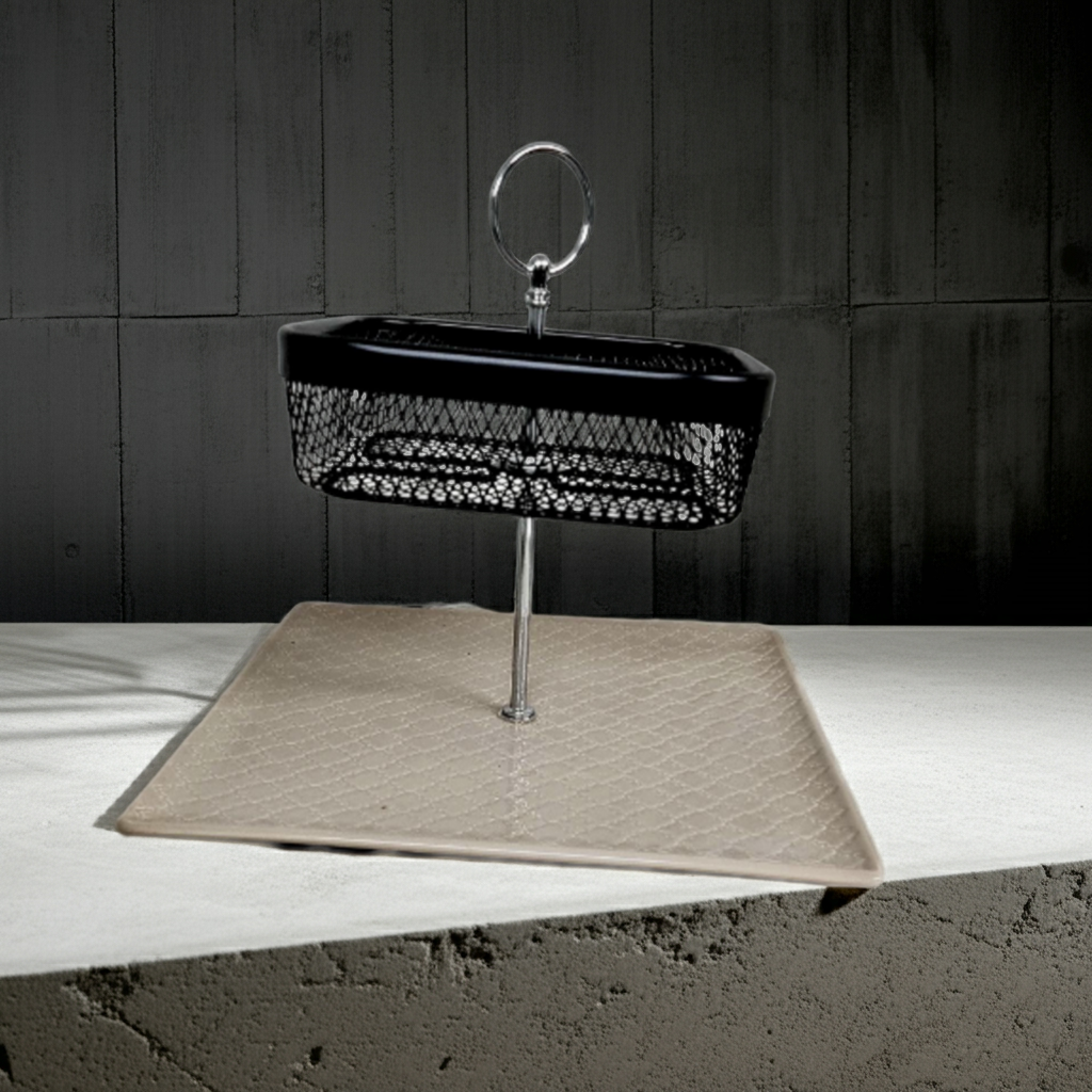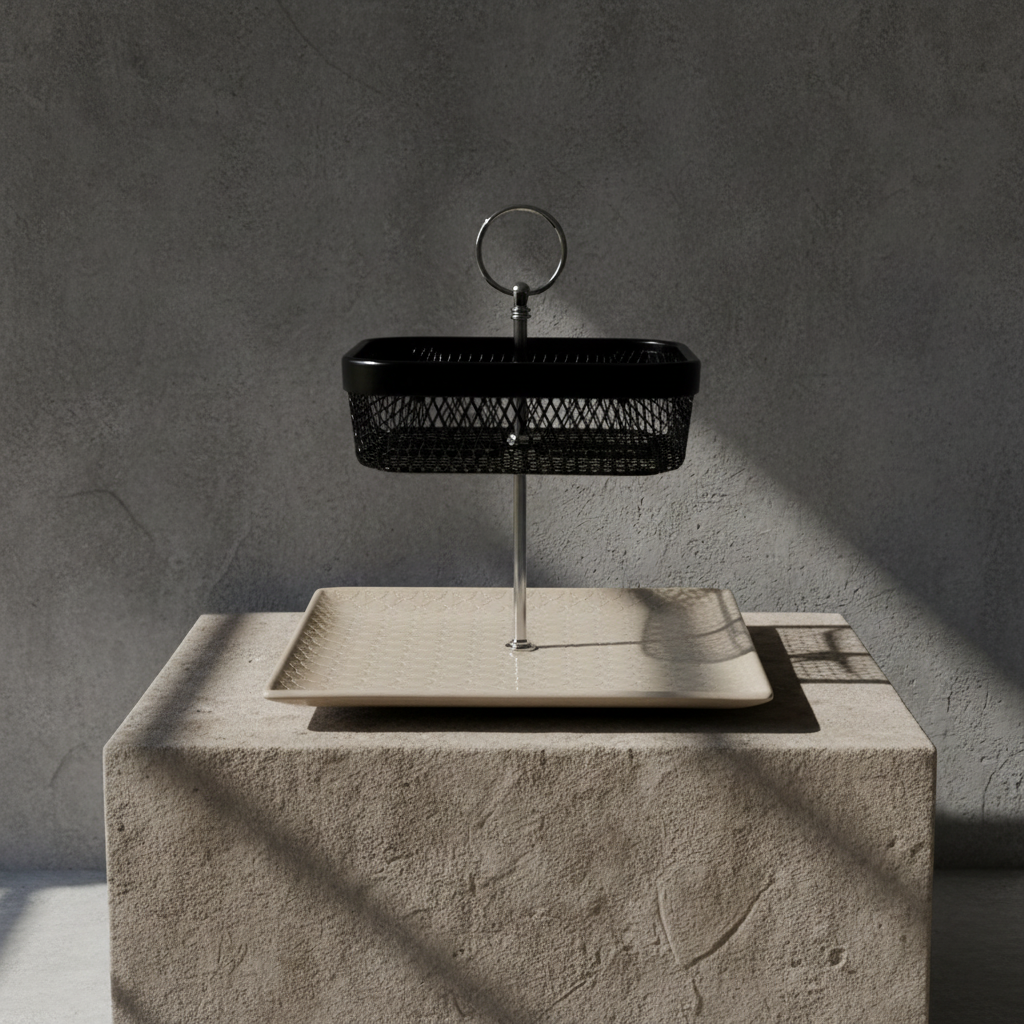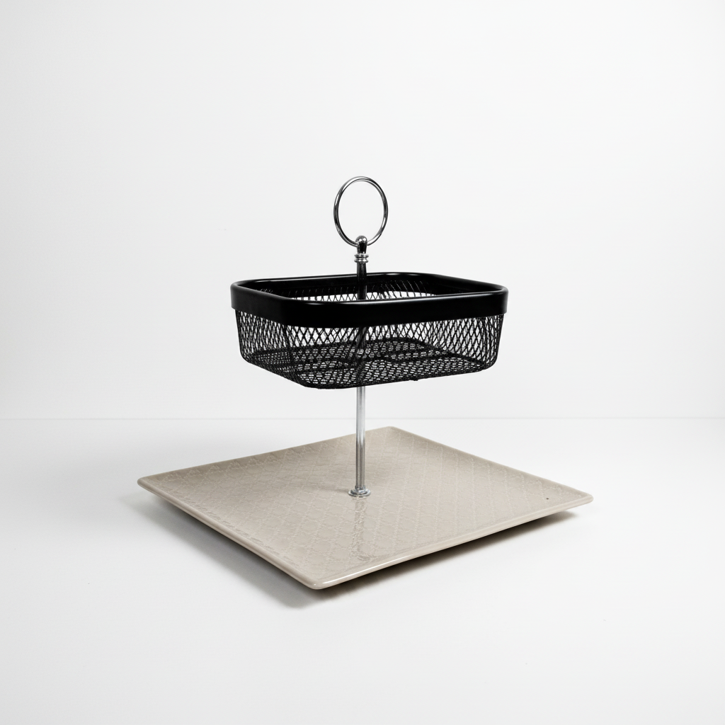 Der große untere Teller hat einen Durchmesser von 20 cm; der Drahtkorb misst in den Dimensionen von 17 x 6 cm.